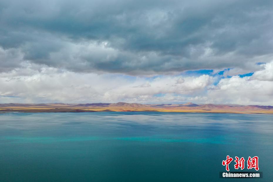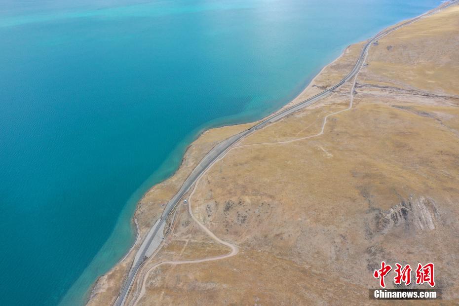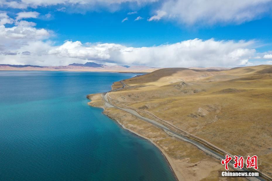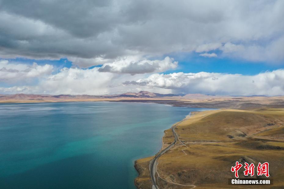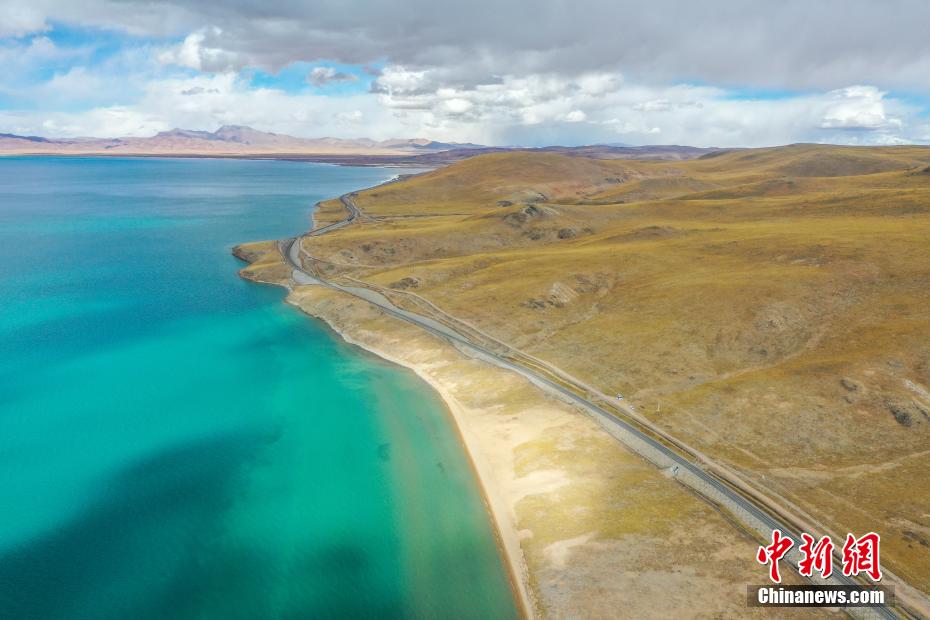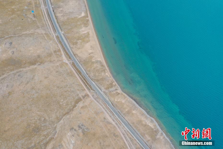 10月24日,鳥瞰深秋時(shí)節(jié)的錯(cuò)那湖,美景如畫。錯(cuò)那湖位于西藏自治區(qū)那曲市安多縣境內(nèi),是怒江的源頭湖。湖水在陽(yáng)光的照耀下,波光粼粼,湖岸線蜿蜒曲折,與周圍的山脈、鐵路、草原共同描繪出一幅美麗的畫卷。中新社記者 貢嘎來(lái)松 攝