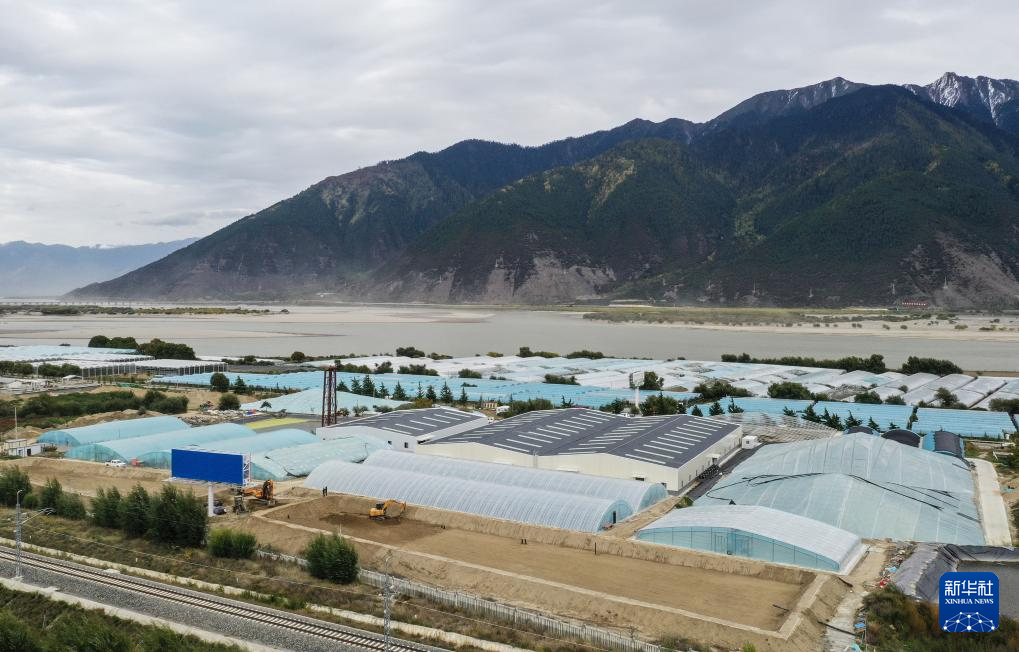 在西藏林芝市米林農(nóng)場內(nèi)的粵林高原漁業(yè)科技園,依托當(dāng)?shù)赜欣h(huán)境而興建的養(yǎng)殖育種基地初顯規(guī)模(無人機(jī)照片,10月24日攝)。新華社記者 李賀 攝