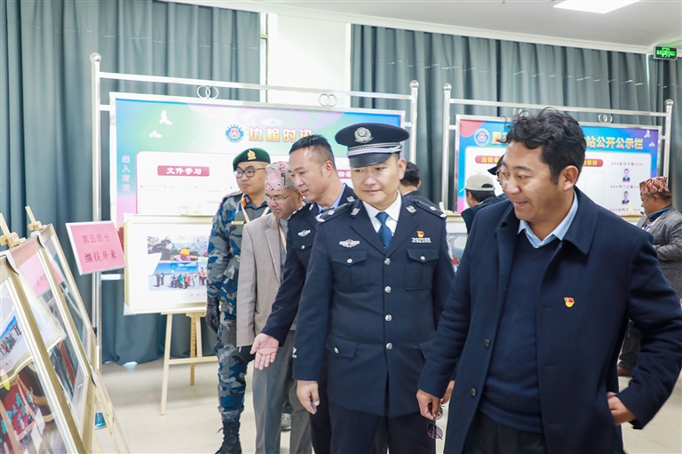 中尼雙方參加里孜口岸通關(guān)一周年慶典主要領(lǐng)導參觀里孜邊檢一周年成果展。