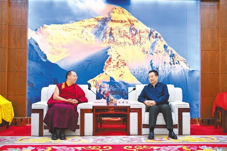 調研結束后,王君正在日喀則市會見了班禪額爾德尼·確吉杰布,對其在藏各項活動的順利開展、圓滿成功表示祝賀。王君正指出,班禪額爾德尼·確吉杰布回藏履職以來,深入貫徹習近平總書記關于宗教工作、西藏工作的重要指示和新時代黨的治藏方略,深入學習宣傳“三個意識”,廣泛接觸基層干部群眾和寺廟僧尼,積極宣傳黨的民族宗教政策,在推進藏傳佛教中國化、鑄牢中華民族共同體意識、引導信眾投身社會主義現(xiàn)代化新西藏建設等方面做了積極有效的工作。希望班禪額爾德尼·確吉杰布進一步學習領會習近平總書記重要指示精神,堅定不移維護祖國統(tǒng)一、加強民族團結,全力維護社會和諧穩(wěn)定的良好局面;堅定不移推進藏傳佛教中國化,對教規(guī)教義作出通俗易懂、與時俱進的闡釋;堅定不移深化拓展“國家意識、公民意識、法治意識”教育,把各方面力量凝聚起來,奮力推進社會主義現(xiàn)代化新西藏建設。