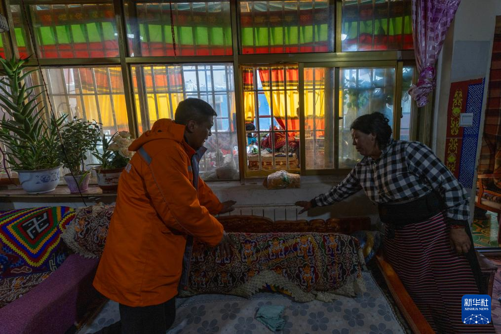 措勤縣城區(qū)清潔能源集中供暖特許經營項目工作人員次旺羅布(左)在扎日南木錯社區(qū)居民曲珍家查看供暖情況(11月20日攝)。新華社記者 姜帆 攝