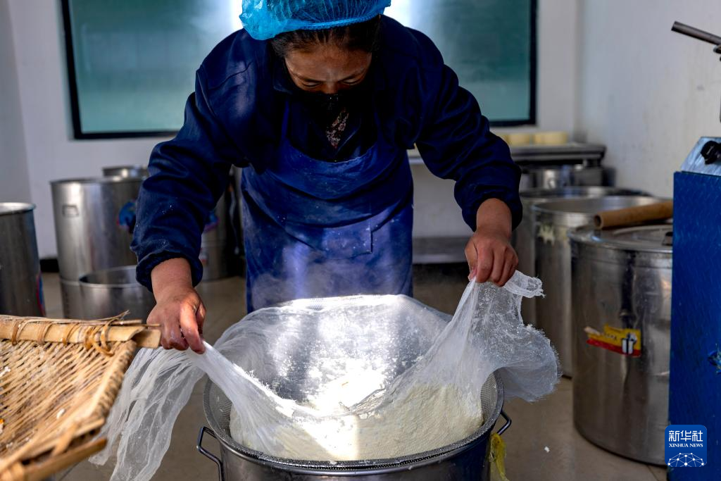 11月28日,在基地就業(yè)的當(dāng)?shù)貑T工索朗卓瑪在用傳統(tǒng)工藝制作奶渣。新華社記者 姜帆 攝