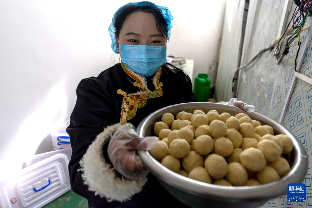11月28日,在基地就業(yè)的牧民白瑪卓嘎展示剛剛做好的奶制品。新華社記者 姜帆 攝