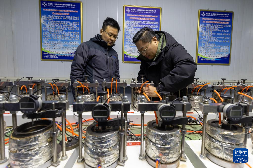中交第一公路勘察設(shè)計研究院有限公司格爾木觀測研究基地主任陳冬根(左)與同事在實驗室里檢查凍土樣品(12月3日攝)。新華社記者 姜帆 攝