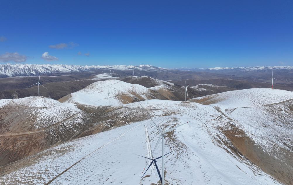 位于昌都市的西藏八宿10萬(wàn)千瓦保障性并網(wǎng)風(fēng)電項(xiàng)目,最高機(jī)艙達(dá)海拔5305米(無(wú)人機(jī)照片)。(宋先吉 攝)