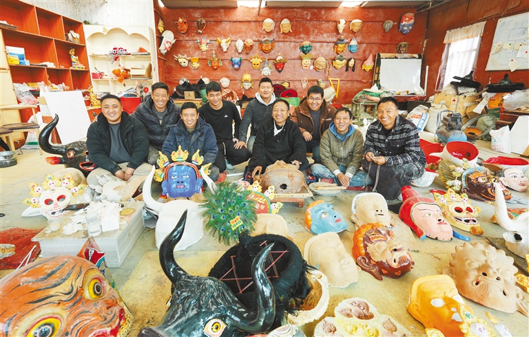 在拉薩市達孜區(qū)雪鄉(xiāng)民間傳統(tǒng)手工藝農(nóng)民專業(yè)合作社的小院里,拉薩布制面具制作技藝西藏自治區(qū)級非遺傳承人西洛和徒弟們忙得熱火朝天,他們正在制作面具。面具制作工序繁雜,制作一個面具包括雕刻、分層、風(fēng)干和噴漆等十幾道工序。2012年,在政府的扶持下,西洛創(chuàng)辦了傳統(tǒng)手工藝合作社,主要制作和銷售藏戲面具。西洛制作的面具造型精美,廣泛運用于藏戲表演中?!懊婢叩膬r格從幾百元到幾萬元不等,大部分訂單來自西藏的各大藏戲團?!蔽髀逭f。近年來,合作社不斷吸納當(dāng)?shù)厝罕妼W(xué)習(xí)面具制作技藝,不僅為當(dāng)?shù)厝罕娞峁┚蜆I(yè)機會,也進一步助力非物質(zhì)文化遺產(chǎn)的保護和發(fā)展。
