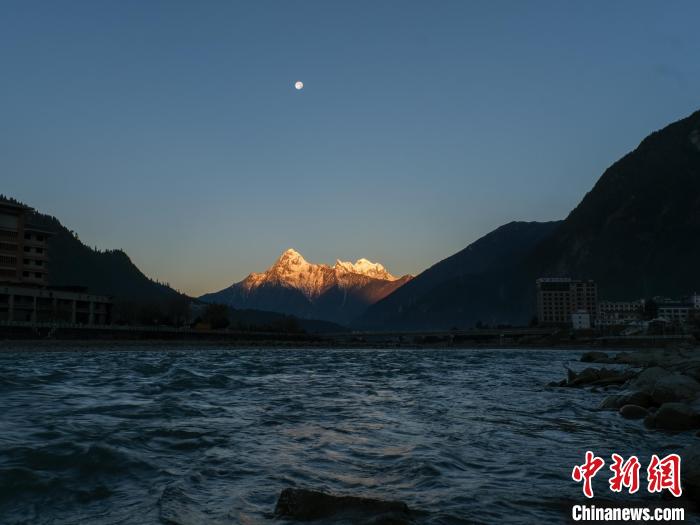 12月17日清晨日出時(shí)分,西藏波密縣出現(xiàn)“日照金山”與月亮同框的景色。中新社記者 江飛波 攝