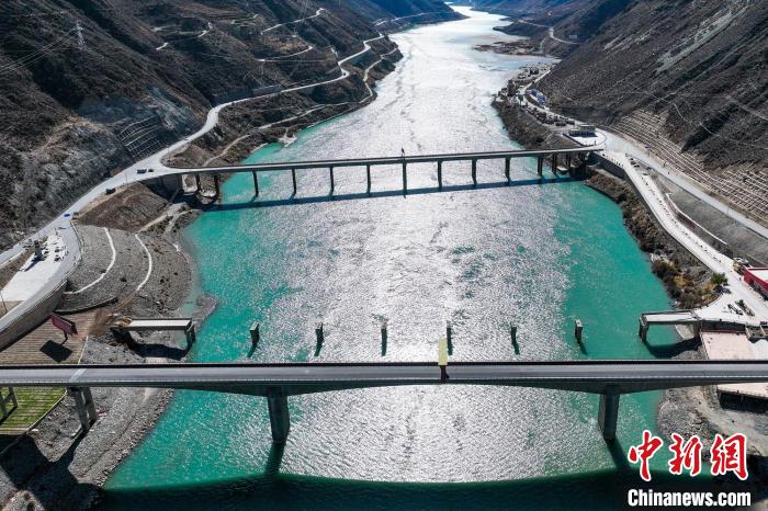 圖為12月21日,川藏交界金沙江上的數(shù)代橋梁。(無人機畫面)薛蒂 攝