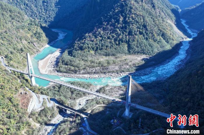 川藏公路西藏波密段昔日的“通麥天險”路段如今已被大橋及隧道取代,圖為12月18日,迫龍溝特大橋與帕隆藏布江。(無人機畫面)中新社記者 趙凜松 攝