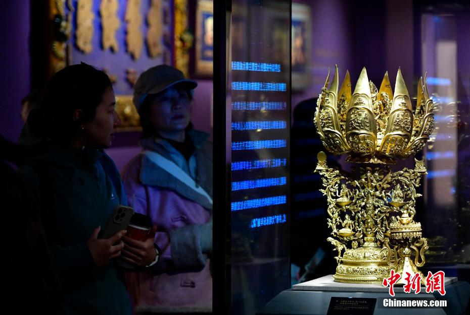 以“見證與守望——鑄牢中華民族共同體意識主題展”為主題的展覽近日亮相西藏自治區(qū)拉薩市布達(dá)拉宮珍寶館。本次主題展精選100余件文物珍品,展覽通過文物、古籍及布達(dá)拉宮的傳承與發(fā)展,講述各民族交往交流交融的故事。圖為1月2日,觀眾欣賞展覽中的明代“大明永樂年施”款八瓣蓮花大威德金剛曼陀羅。中新社記者 李林 攝