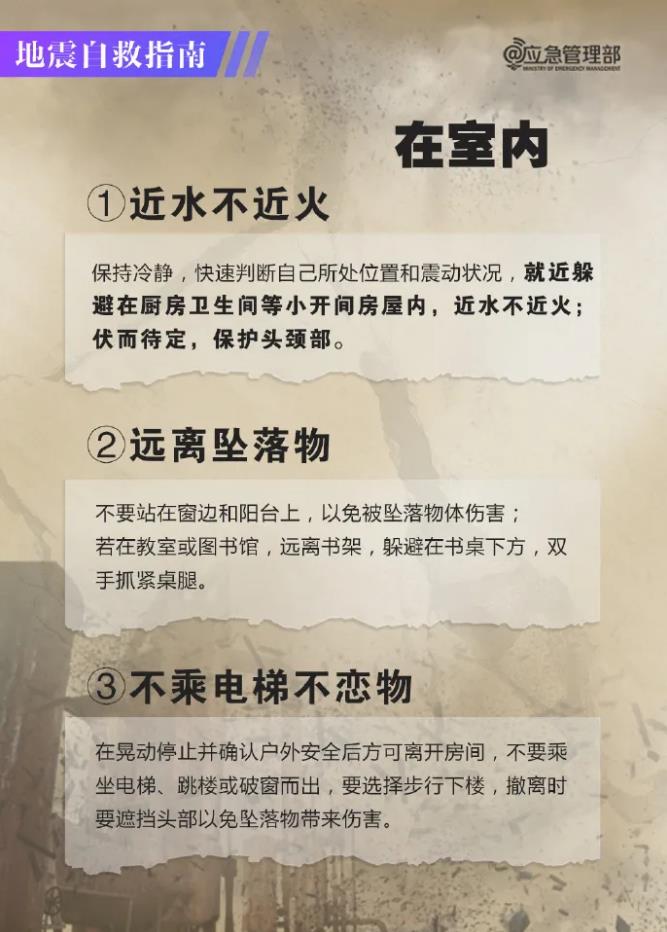 比如唐山地震我們總結(jié)了“震時就近躲避,震后迅速疏散”的方法,汶川地震我們總結(jié)了“能跑則跑,不能跑則躲”,一些強(qiáng)有感地震總結(jié)了“不能跳樓、不能盲目外逃”。