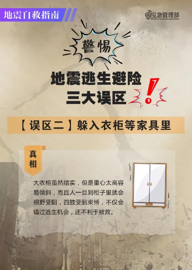 我們要遠(yuǎn)離主墻面、門窗和有高大家具的地方,迅速到衛(wèi)生間、廚房等小開間房間躲避,等晃動停止后,再沿消防通道有序疏散,以防后續(xù)余震的影響。疏散時禁止乘坐電梯,也不提倡在有地震的時候,利用繩索逃生。