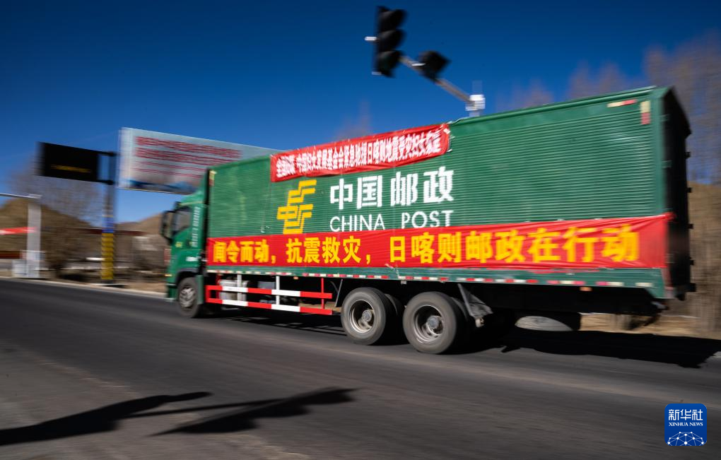 1月8日,在日喀則市境內(nèi)的318國道,中國郵政的抗震救災(zāi)運輸車輛向災(zāi)區(qū)方向駛?cè)ァP氯A社記者 丁增尼達 攝