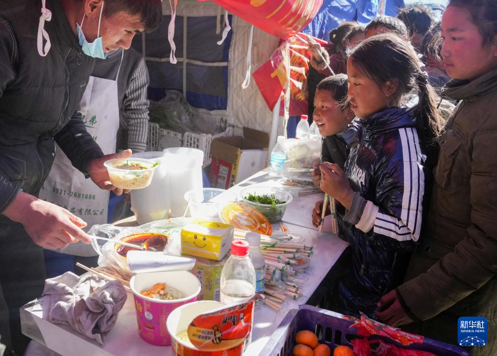 1月8日,在日喀則市定日縣長所鄉(xiāng)森嘎村的臨時安置點,馬仁(左一)為受災(zāi)小朋友免費供應(yīng)面食。據(jù)馬仁介紹,他來自定日縣,和朋友一起來臨時安置點為災(zāi)區(qū)群眾免費提供面食。據(jù)悉,從7日下午兩點開始,他們已送出近1200份面食。新華社記者 丁汀 攝