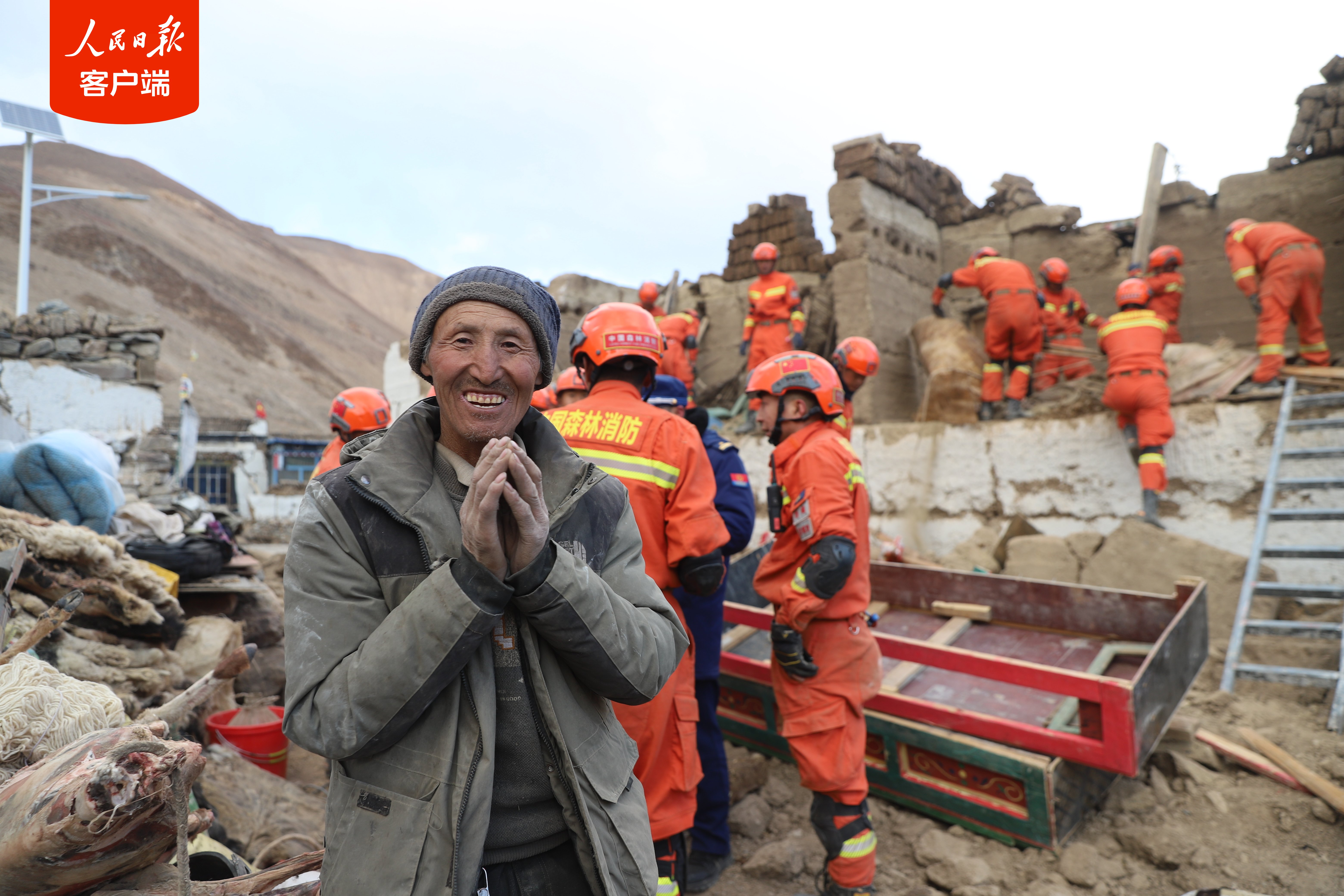 1月7日,西藏日喀則市定日縣發(fā)生6.8級地震后,西藏森林消防總隊指戰(zhàn)員第一時間趕赴受災嚴重的措果鄉(xiāng)野江村展開救援。救援人員把埋在廢墟里的牦牛和生活物資搶救出來后,村民雙手合十,真誠感謝黨和國家,感謝救援人員。