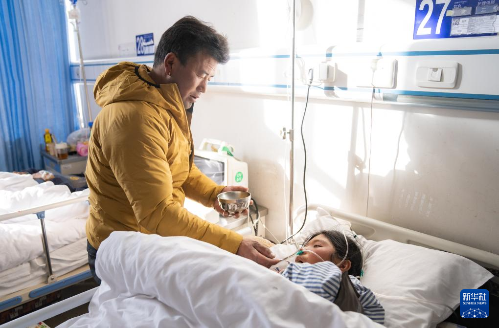 1月9日,在日喀則市人民醫(yī)院婦產(chǎn)科病房,產(chǎn)婦家人在喂產(chǎn)婦吃飯。新華社記者 丁增尼達 攝