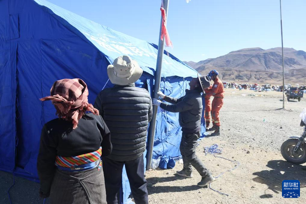 1月9日,村干部和救援人員在措布村幫助受災(zāi)群眾搭建帳篷。新華社記者 姜帆 攝