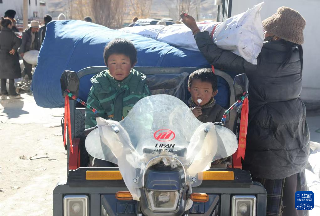 1月9日,受災(zāi)群眾在措布村卸載救災(zāi)物資。新華社記者 李響 攝
