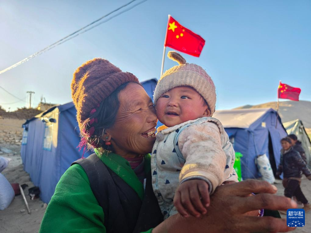 1月10日,在定結(jié)縣郭加鄉(xiāng)乃村安置點(diǎn),一名老人在哄孩子。新華社記者 李華 攝