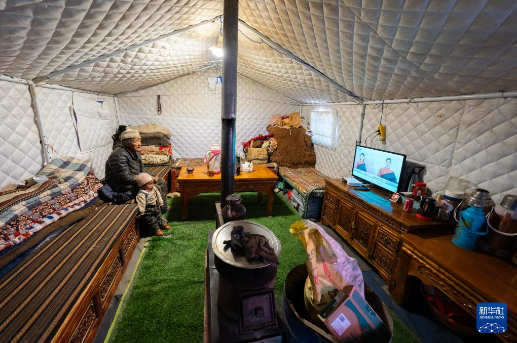 1月10日,在定結(jié)縣郭加鄉(xiāng)乃村安置點(diǎn),老人和孩子在救災(zāi)帳篷里看電視。新華社記者 丁增尼達(dá) 攝