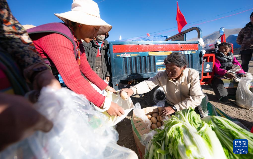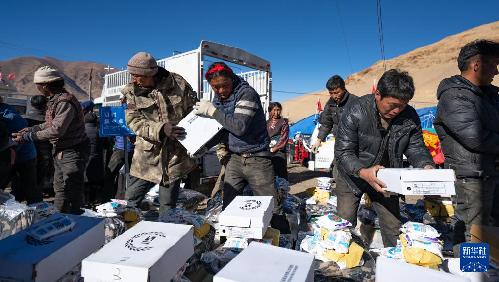 1月10日,在定結(jié)縣郭加鄉(xiāng)切村安置點(diǎn),群眾分配救災(zāi)物資。新華社記者 丁增尼達(dá) 攝