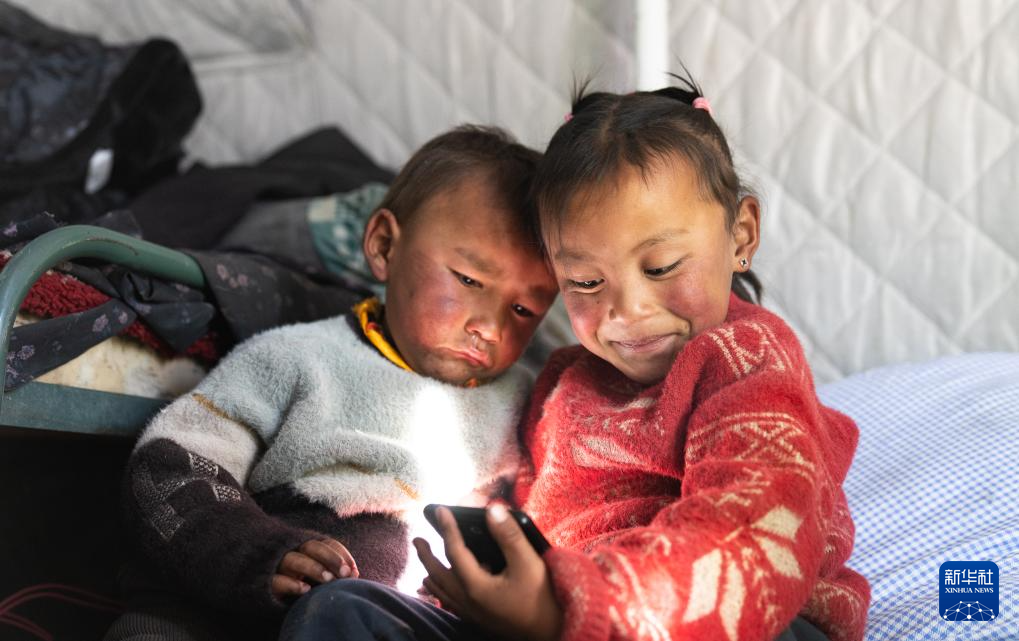 1月10日,在定結(jié)縣郭加鄉(xiāng)切村安置點(diǎn),姐弟倆在帳篷里依偎著玩手機(jī)。新華社記者 丁增尼達(dá) 攝
