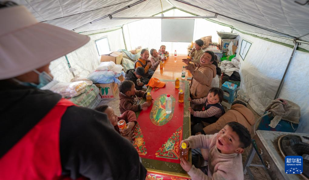 1月10日,在定結(jié)縣郭加鄉(xiāng)乃村安置點(diǎn),孩子們?cè)趯W(xué)生臨時(shí)學(xué)習(xí)區(qū)做游戲。新華社記者 丁增尼達(dá) 攝