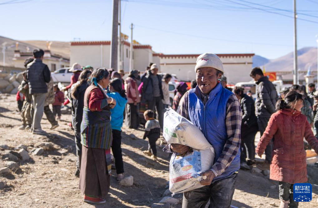 1月10日,在定結(jié)縣郭加鄉(xiāng)切村安置點(diǎn),領(lǐng)到大米的老人露出笑容。新華社記者 丁增尼達(dá) 攝