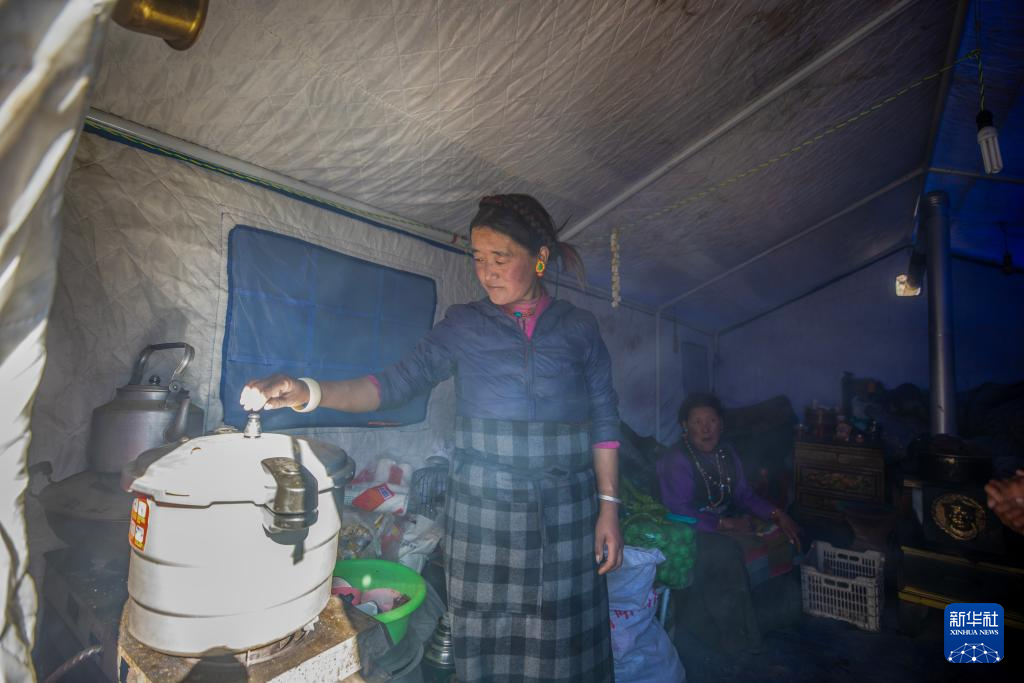 1月11日,受災(zāi)群眾次仁措姆在普村安置點(diǎn)的帳篷里做飯。新華社記者 姜帆 攝