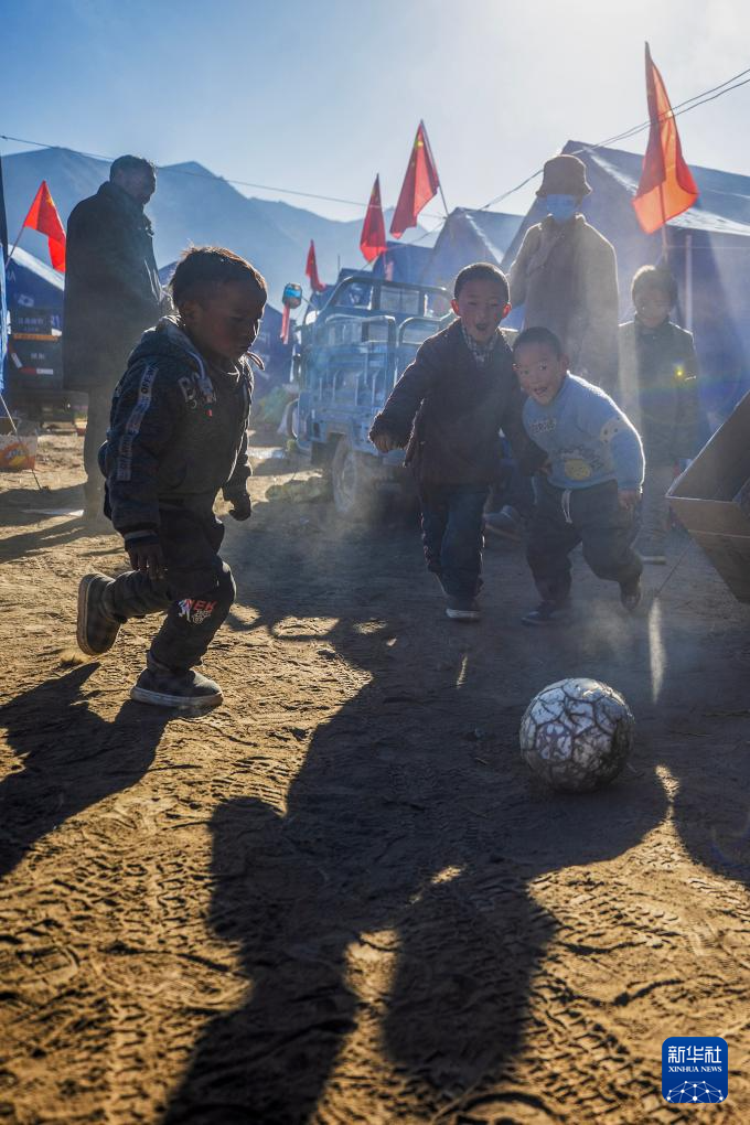 1月11日,小朋友在普村安置點(diǎn)踢球。新華社記者 姜帆 攝