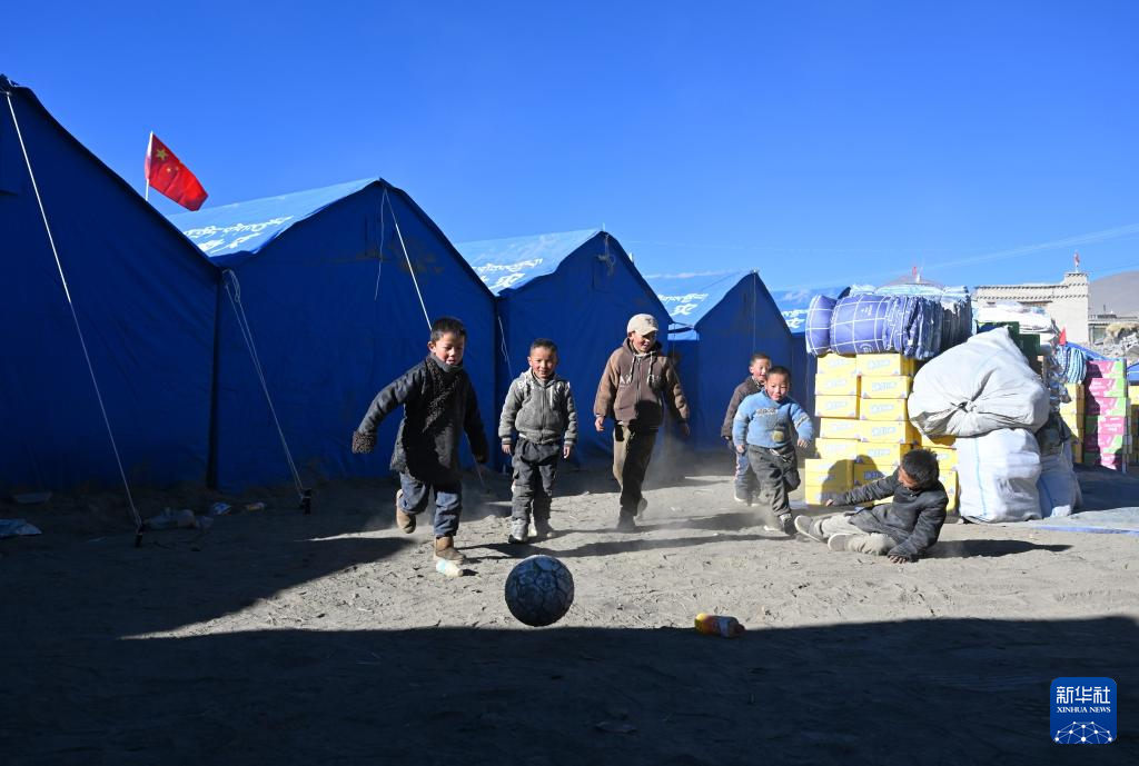 1月11日,小朋友在普村安置點(diǎn)踢球。新華社記者 李響 攝