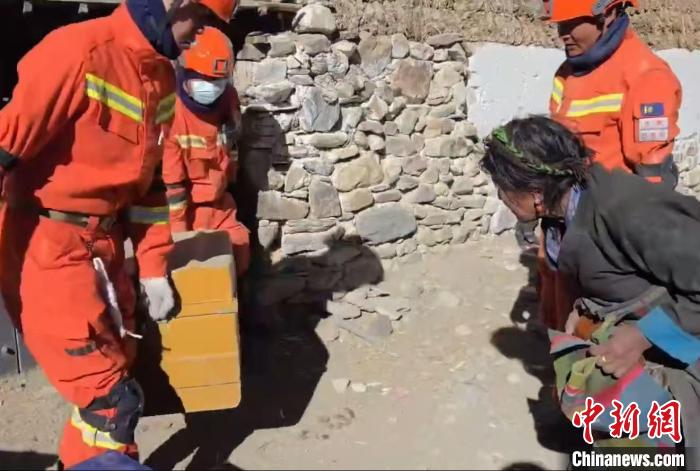 圖為日喀則市森林消防大隊隊員將受損房屋內(nèi)搜尋到的財物交付受災村民手中。米瑪次仁 攝