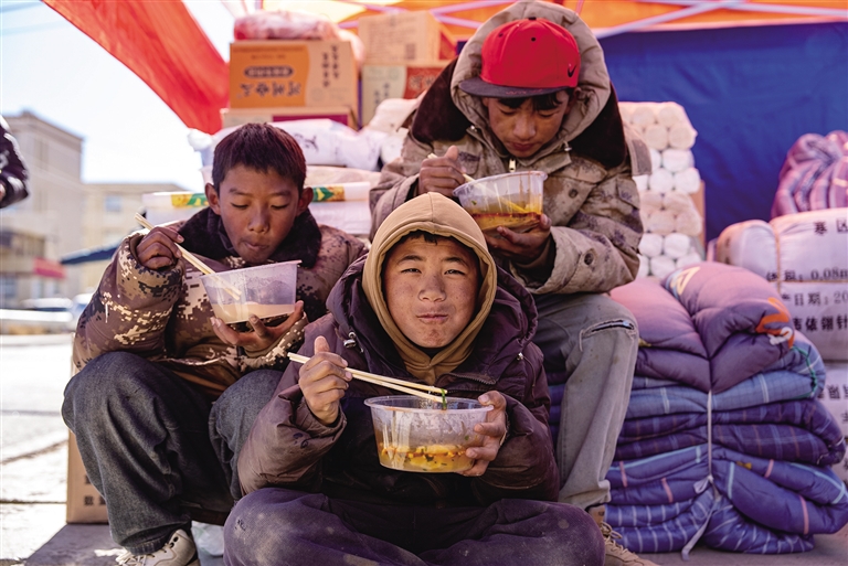 在長所鄉(xiāng)森嘎村安置點(diǎn),來自定日縣崗嘎鎮(zhèn)的普桑和其他3名村民正在給受災(zāi)群眾與救援人員分發(fā)“巴突”(藏語音譯,意為面疙瘩)?!敖裉焐衔缥覀冏龅摹畯?qiáng)歸’(藏語音譯,意為煮青稞酒和糌粑),中午做的‘巴突’,這是我們的傳統(tǒng)美食,吃了全身都會(huì)暖乎乎的。大家互幫互助,一切都會(huì)慢慢好起來的。”普桑說。