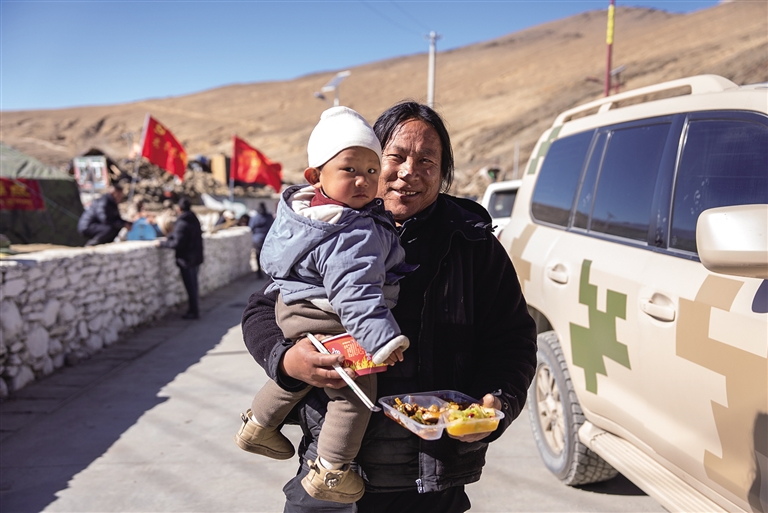 定日縣長所鄉(xiāng)古榮村的受災(zāi)群眾收到熱騰騰的飯菜。