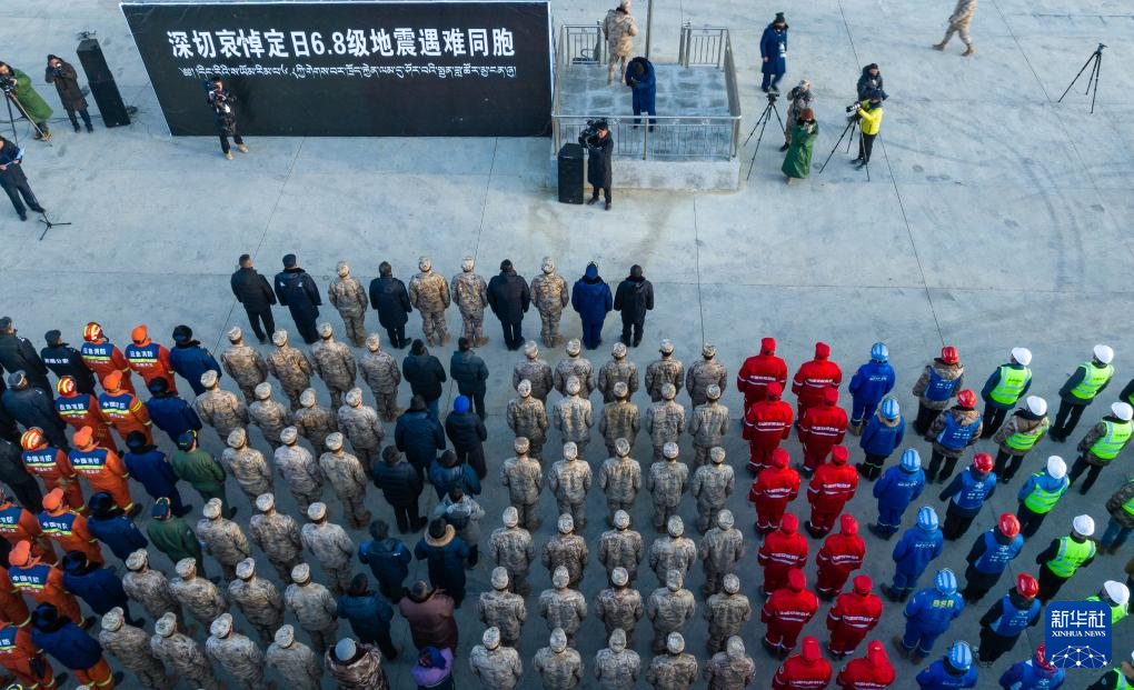 1月13日上午9時30分,西藏定日6.8級地震遇難同胞悼念儀式在受災最嚴重的長所鄉(xiāng)舉行。參與救援的解放軍和武警官兵、消防救援人員、公安民警、醫(yī)護人員、青年志愿者及有關企業(yè)員工、干部職工、震區(qū)群眾代表數(shù)百人,脫帽肅立,向遇難同胞默哀3分鐘。新華社記者 丁增尼達 攝