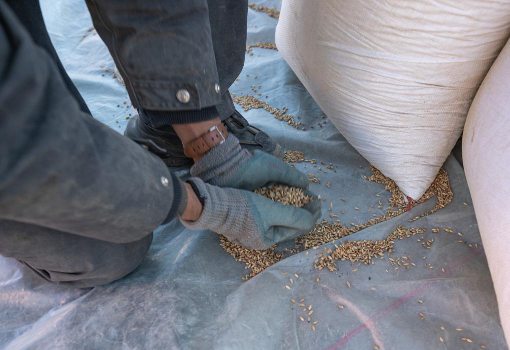 1月13日,在定日縣長所鄉(xiāng)古榮村,公安干警用手捧起灑在地上的青稞。新華社記者丁增尼達 攝
