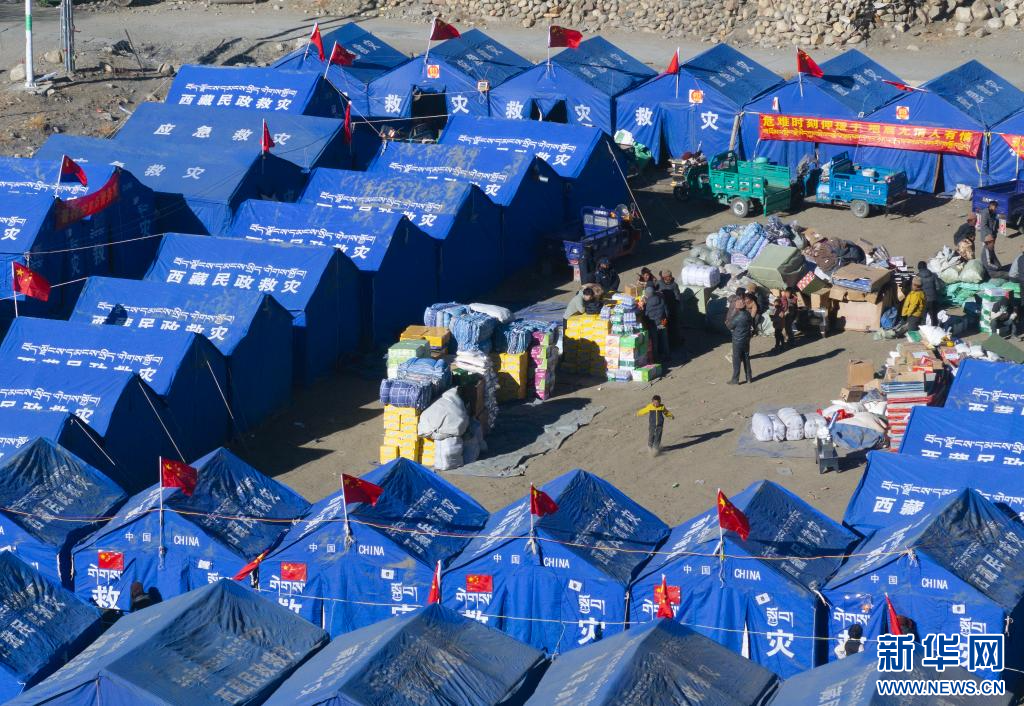 1月10日,在定日縣民族團結廣場,人們搬運將要運往受災群眾安置點的過冬物資。新華社記者 沈伯韓 攝