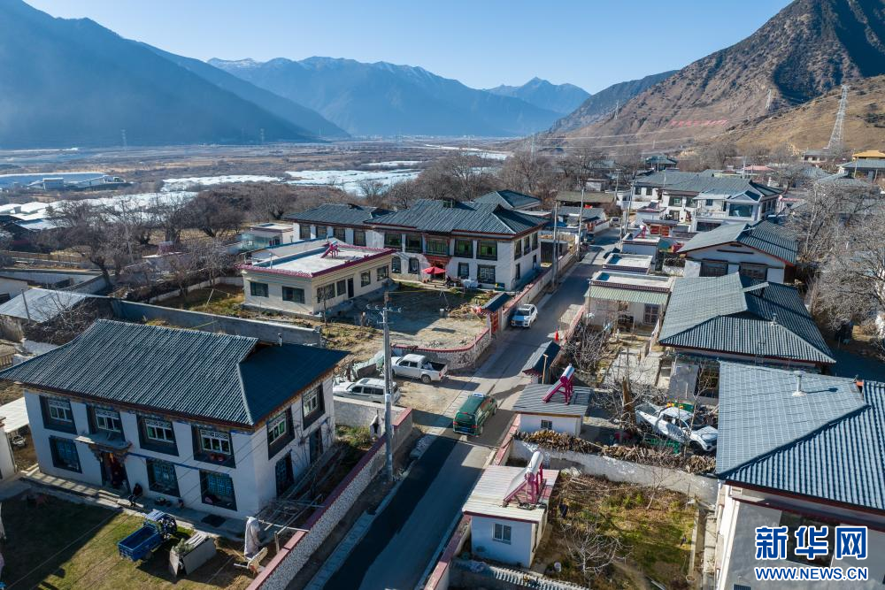 1月19日,西藏林芝市“郵快合作”新配備的郵遞車穿行在鄉(xiāng)村小巷(無人機(jī)照片)。新華網(wǎng) 旦增努布 攝