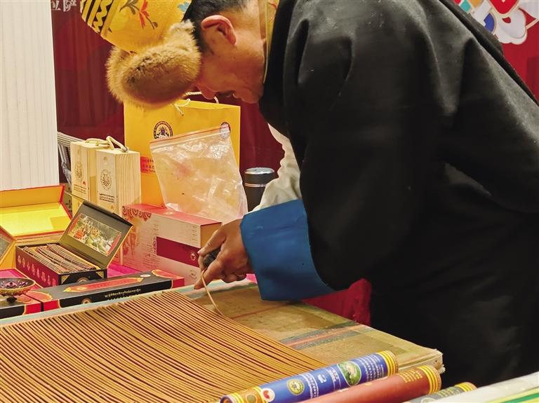 展銷活動現(xiàn)場,一股淡雅香氣彌漫開來,藏香展位上,線香靜靜燃燒。拉薩市級非物質(zhì)文化遺產(chǎn)代表性傳承人加措正在制作藏香,吸引不少人駐足觀看。市民鄭先生說:“以前只見過藏香成品,第一次看制作過程,很驚喜。春節(jié)申遺成功后,非遺受關注更多,希望西藏非遺好物能被更多人了解!”
