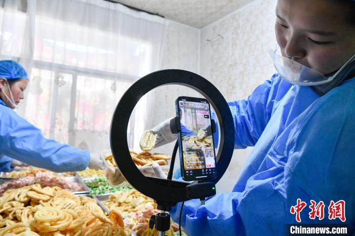 2月10日,西藏拉薩市林廓北路一家卡塞店里,工人在直播賣卡塞?!翱ㄈ笔且环N油炸面食,是藏歷新年必不可少的食物。隨著藏歷新年的日益臨近,古城拉薩各個(gè)加工銷售“卡塞”的店鋪飄出陣陣香味。中新社記者 貢嘎來松 攝