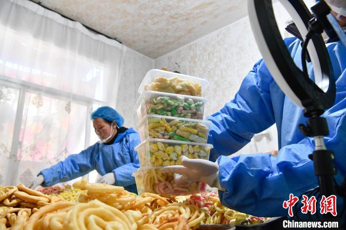 2月10日,西藏拉薩市林廓北路一家卡塞店里,工人在直播賣卡塞。“卡塞”是一種油炸面食,是藏歷新年必不可少的食物。隨著藏歷新年的日益臨近,古城拉薩各個(gè)加工銷售“卡塞”的店鋪飄出陣陣香味。中新社記者 貢嘎來松 攝