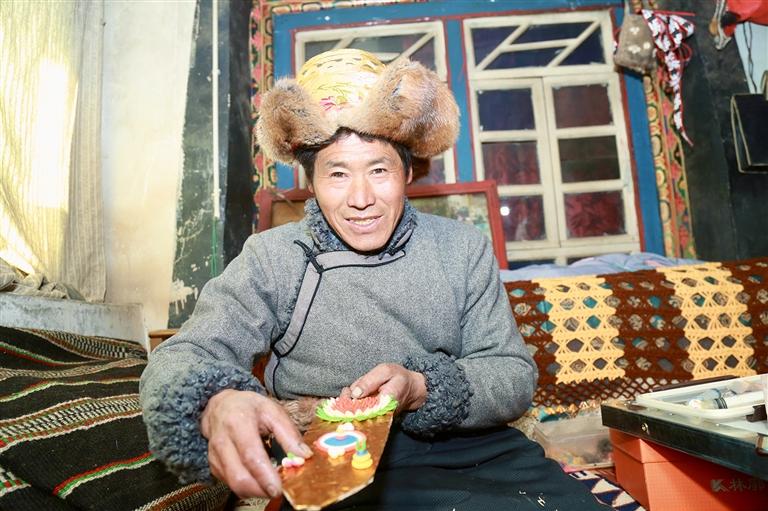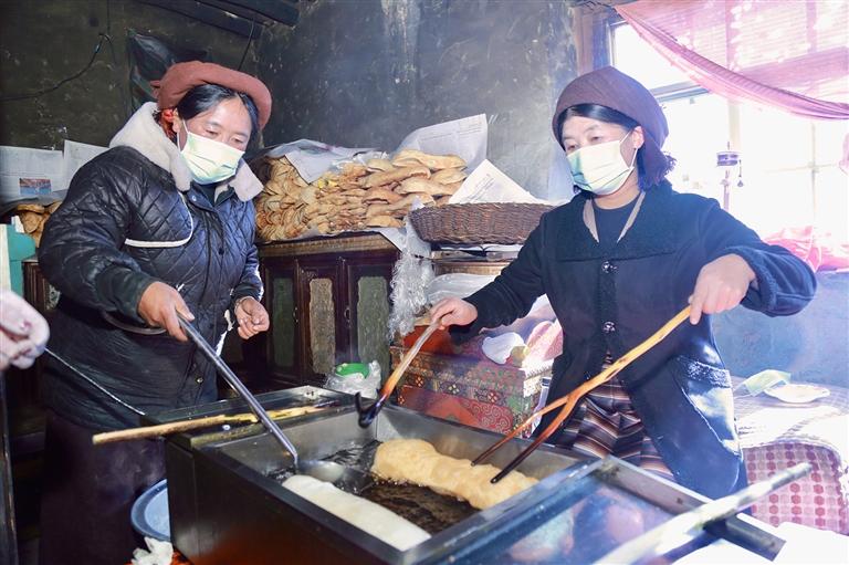 “德卡”,作為傳統(tǒng)藏式點(diǎn)心“卡塞”的一種,在藏歷新年的年貨清單里占據(jù)著不可或缺的位置。每到藏歷新年前夕,旦索朗一家便進(jìn)入了一年中最忙碌的時段——經(jīng)營起制作和售賣卡塞的生意。旦索朗回憶起小時候的新年,感慨萬分:“小時候過年,家家戶戶都自己炸卡塞,那時候,整個村子都被卡塞的濃香包圍著?,F(xiàn)在生活條件好了,很多人覺得在外購買德卡更方便省事,這也給我們帶來了商機(jī)。我們做炸德卡的生意已經(jīng)6年了,一直都很受歡迎,還帶動了6名村民一起參與,增加了大家的收入?!?/p>