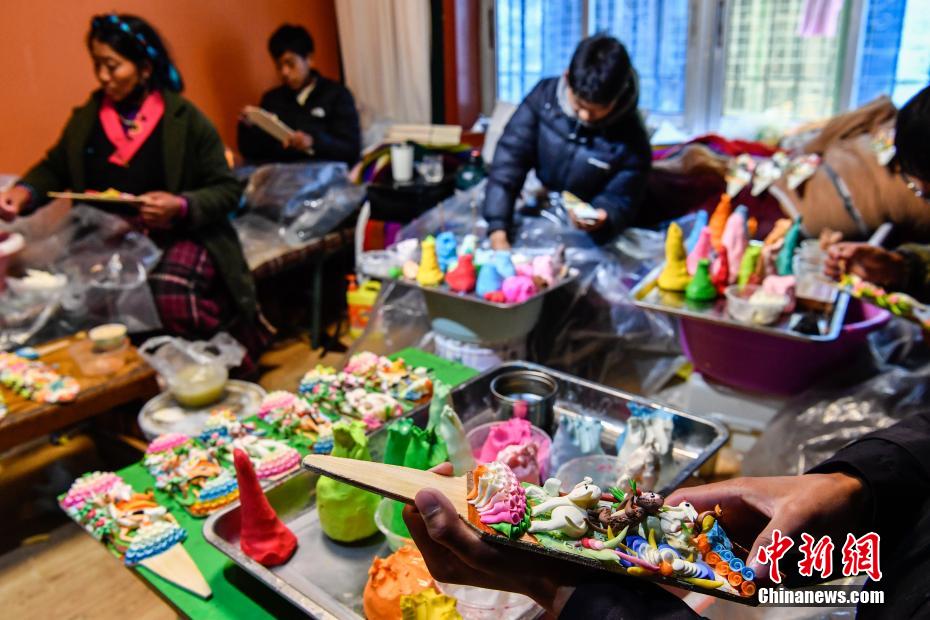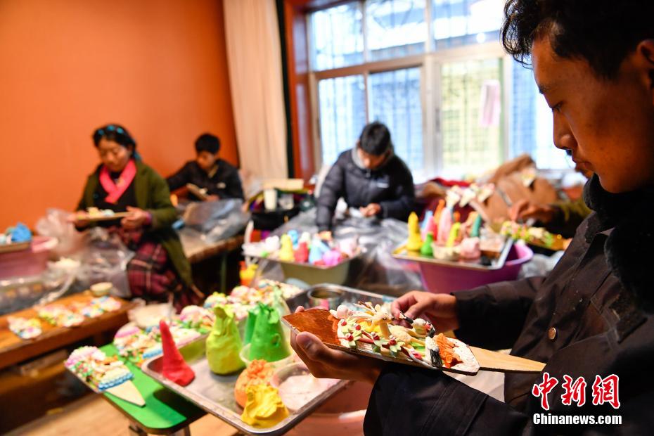 2月15日,手工藝人在拉薩制作酥油花。隨著藏歷新年臨近,酥油花在拉薩年貨市場上熱銷。酥油花在藏語中稱為“孜扎”,是藏族民眾家庭中必備的年貨之一。中新社記者 貢嘎來松 攝