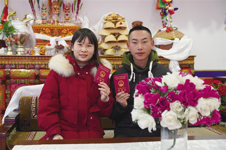 “我們在一起3年了,是表姐牽的紅線?!钡┰龈峦吣樕涎笠缰腋5男θ荩従徴f道,“初次見到卓嘎,我就對她心生好感。相處一段時(shí)間后,我發(fā)現(xiàn)她性格溫柔,和我特別合拍,于是鼓起勇氣向她表白。”他開心地展示著剛剛領(lǐng)到的結(jié)婚證,“情人節(jié)是個(gè)好日子,我們早就計(jì)劃好今天領(lǐng)證,現(xiàn)在終于如愿以償。以后情人節(jié)和結(jié)婚紀(jì)念日合二為一,既能少買一份禮物,也不用擔(dān)心忘記啦?!?/p>