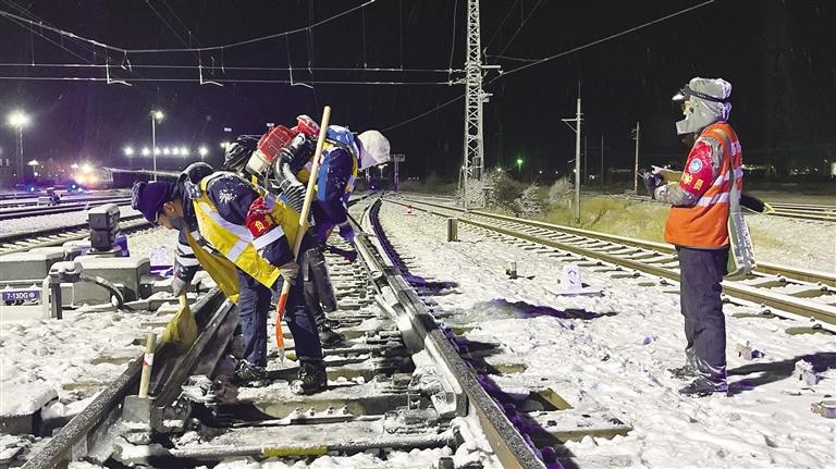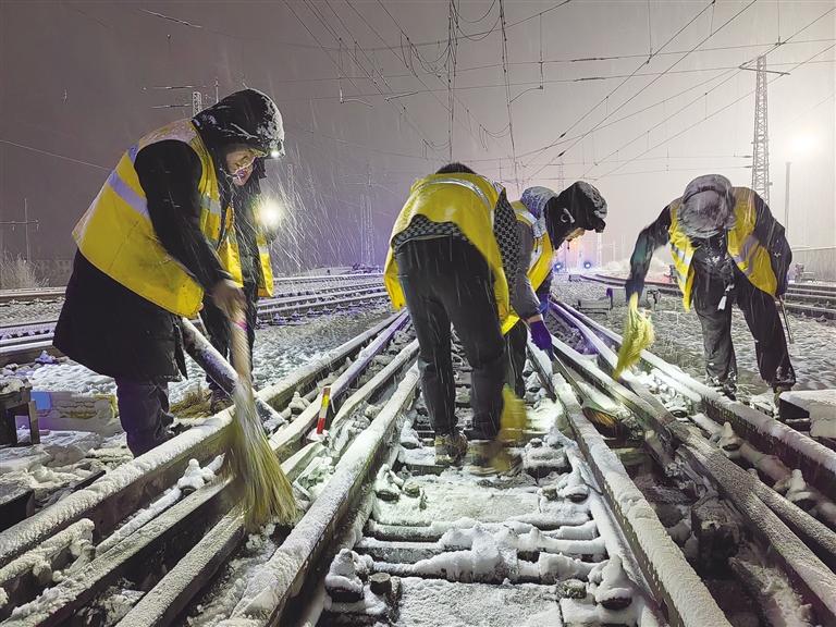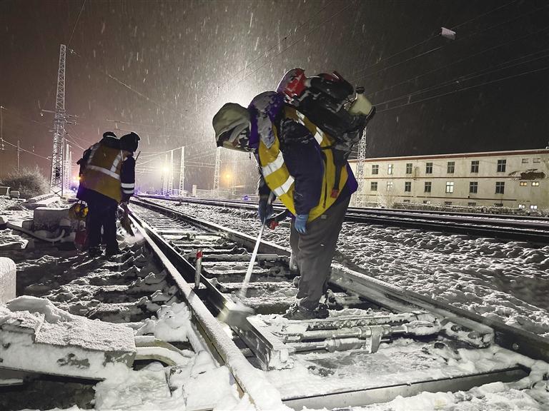 “我們繼續(xù)往前走,檢查下一組道岔?!北M管他們的眉毛、睫毛上都結(jié)滿了冰晶,但這并不能阻擋大家迎戰(zhàn)風(fēng)雪、護(hù)航春運的堅定步伐。7時30分,經(jīng)過長達(dá)300分鐘緊張有序的作業(yè),拉薩西貨場道岔積雪終于清理完畢。