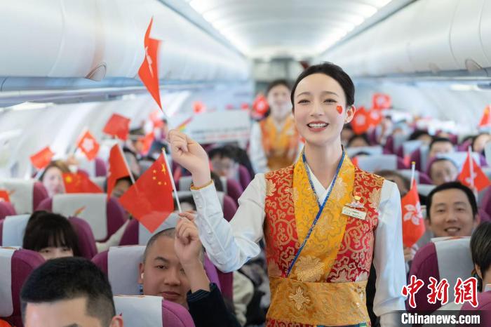 2月19日,西藏航空“拉薩-成都天府-香港”航線(xiàn)開(kāi)通。圖為航班上舉行首航慶祝儀式。西藏航空供圖
