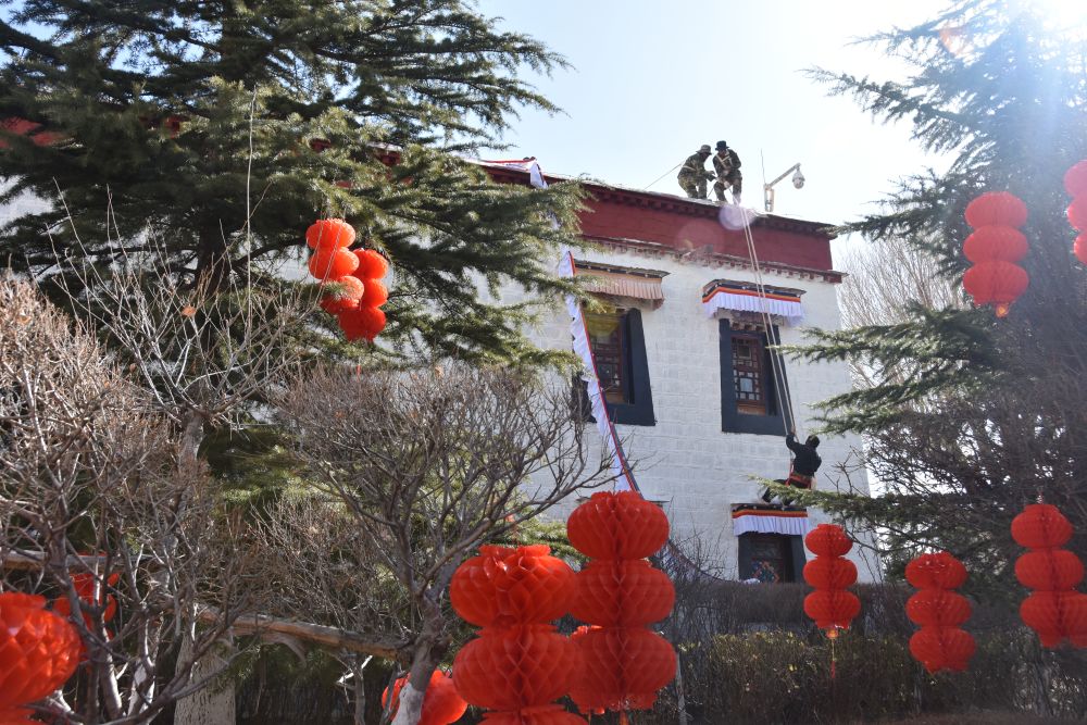 2月18日,布達(dá)拉宮管理處工作人員更換“香布”。新華社記者 春拉 攝