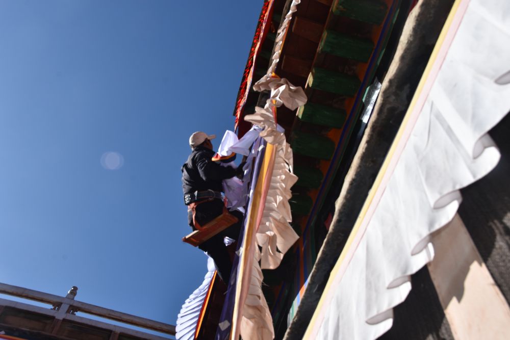 2月28日是藏歷木蛇新年。隨著春天的腳步將近,布達(dá)拉宮迎來這場特別的“換裝”儀式——更換“香布”。“香布”是藏式建筑的裝飾,通常用五彩棉布縫制,主體為白色,搭配紅藍(lán)黃等色的邊沿,對窗沿等的顏料及木構(gòu)件起到保護(hù)作用。