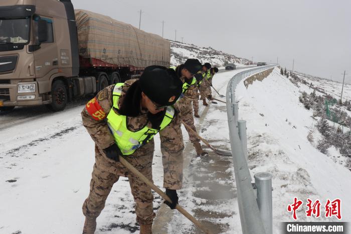 在嚴(yán)寒天氣里,武警官兵克服高寒缺氧的惡劣環(huán)境,累計(jì)清雪5500余立方米,解救滯留車輛200余輛,恢復(fù)道路暢通。
