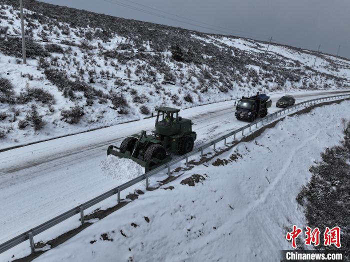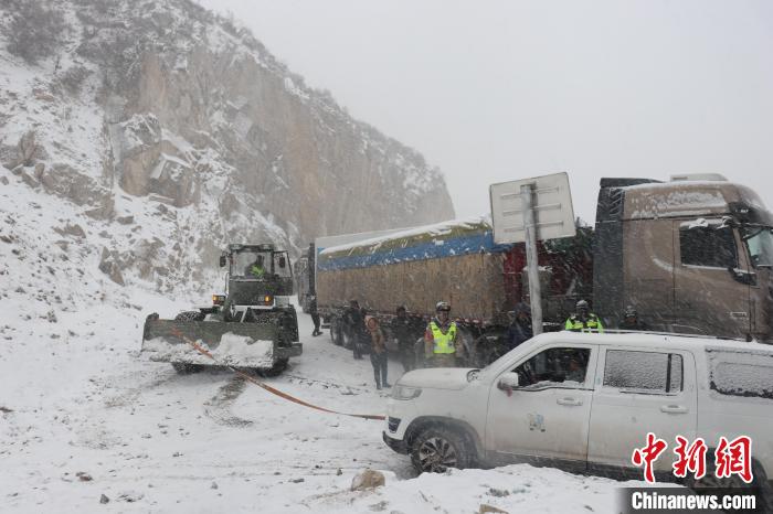 據(jù)了解,災(zāi)情發(fā)生后,擔(dān)負(fù)該路段養(yǎng)護(hù)保通任務(wù)的武警第二機(jī)動(dòng)總隊(duì)某支隊(duì)官兵迅速啟動(dòng)道路除雪保通預(yù)案,抽組專業(yè)救援力量及大型救援裝備趕赴受阻路段實(shí)施搶通。受阻路段平均海拔處于4000米以上,持續(xù)降雪不斷,官兵們首先對(duì)滯留人員進(jìn)行安撫,并發(fā)放食物和藥品等救援物資,為盡快清理路面積雪,官兵采取“機(jī)械協(xié)同先通后擴(kuò)、人機(jī)配合高效救援”的方式同步展開作業(yè)。期間,一輛重載半掛車不慎陷入邊溝中,指揮員果斷調(diào)整方案,封控現(xiàn)場、撒布融雪劑、清理四周積雪、鋼絲繩牽引等步驟緊張有序的進(jìn)行中……伴隨著發(fā)動(dòng)機(jī)的轟鳴聲,車輛被成功救出。